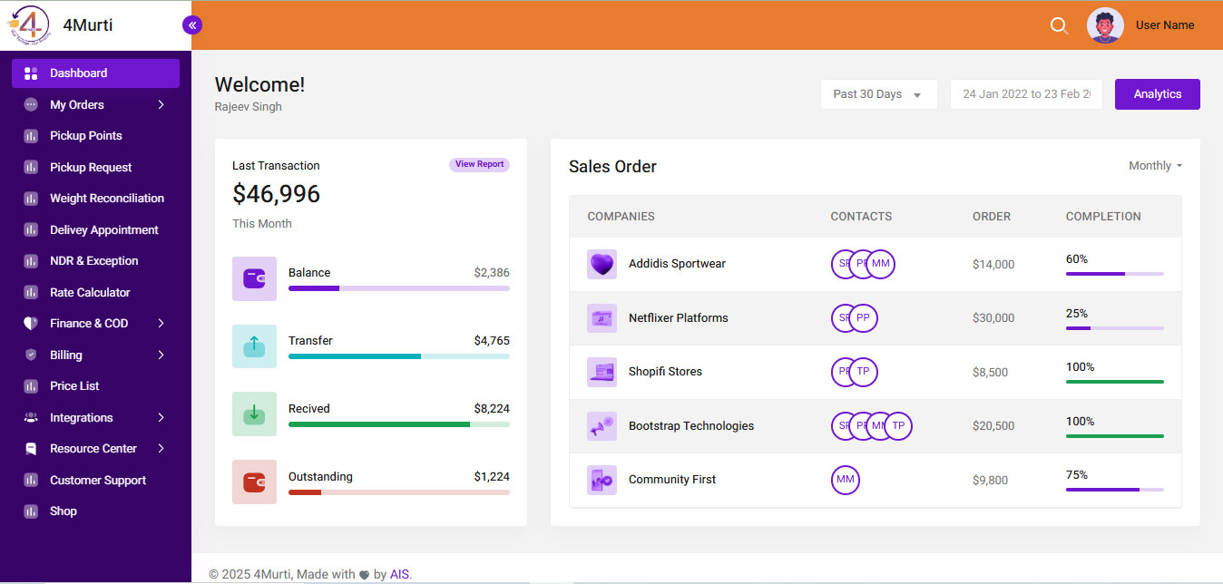 Discover shipping innovation with 4murti, your online marketplace connecting businesses with a vast network of carriers. Our technology-driven platform delivers tailored B2B logistics solutions, reaching 29,000+ pincodes across 20+ cities. Introducing 4Murti, we empower shippers with an innovative bidding system, allowing truckers to offer competitive rates for each shipment. This ensures affordable options for those needing to transport goods while helping dedicated carriers maximize their resources and profits. Enjoy seamless logistics and a streamlined dashboard for ultimate efficiency.